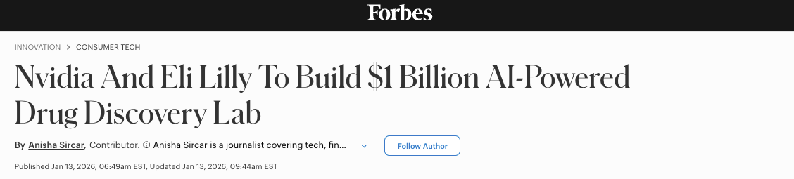 With that backdrop, there is a lot of money being thrown at the problem, with the largest pharma company in the world, Eli Lilly, partnering up with Nvidia to build a $1 billion AI lab: