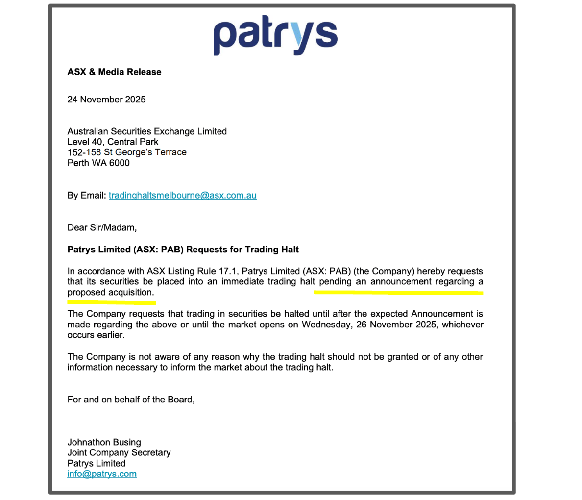 Patrys (ASX:PAB | MC: $12M) enters ASX trading halt pending announcement on a proposed acquisition asset. (PAB)