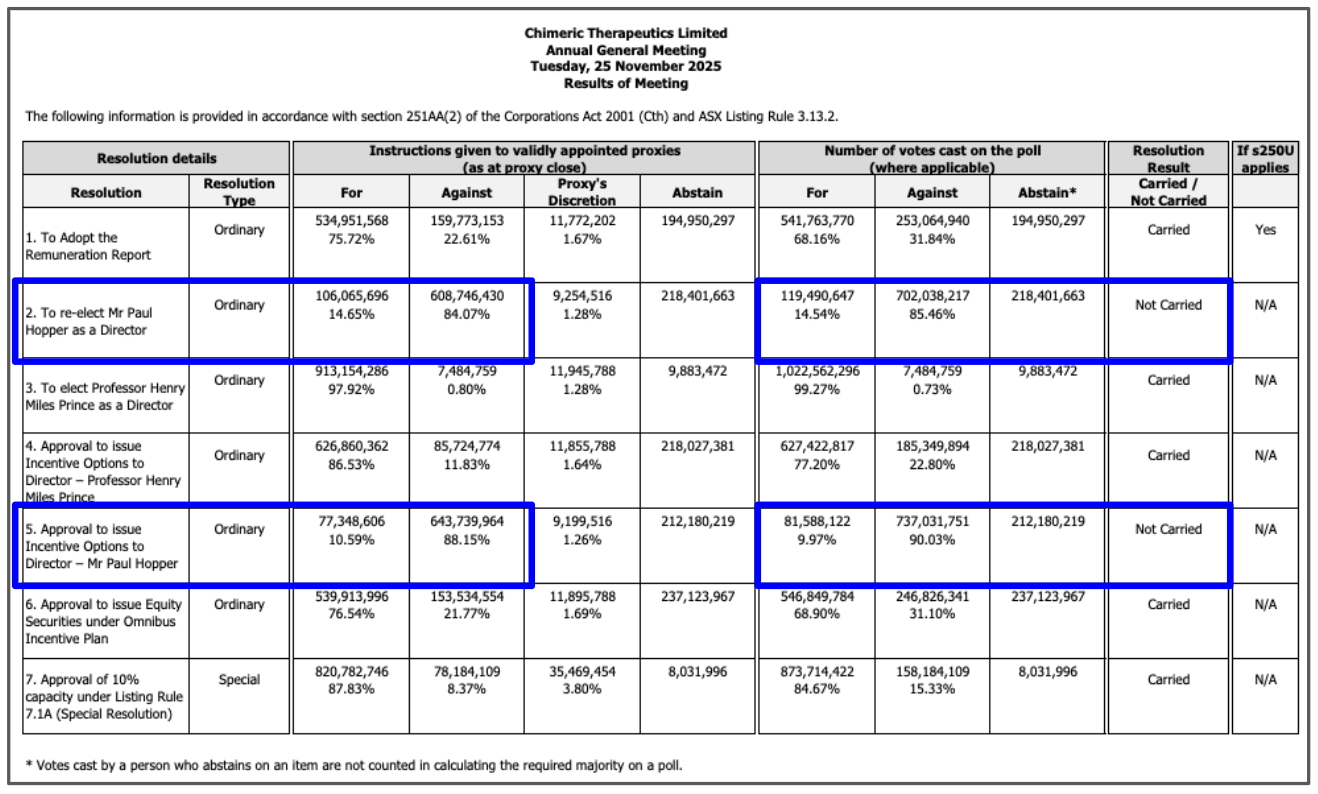 At yesterday’s AGM shareholders of Chimeric Therapeutics (ASX:CHM | MC: $11M) voted AGAINST re-electing Paul Hopper as director of the company.