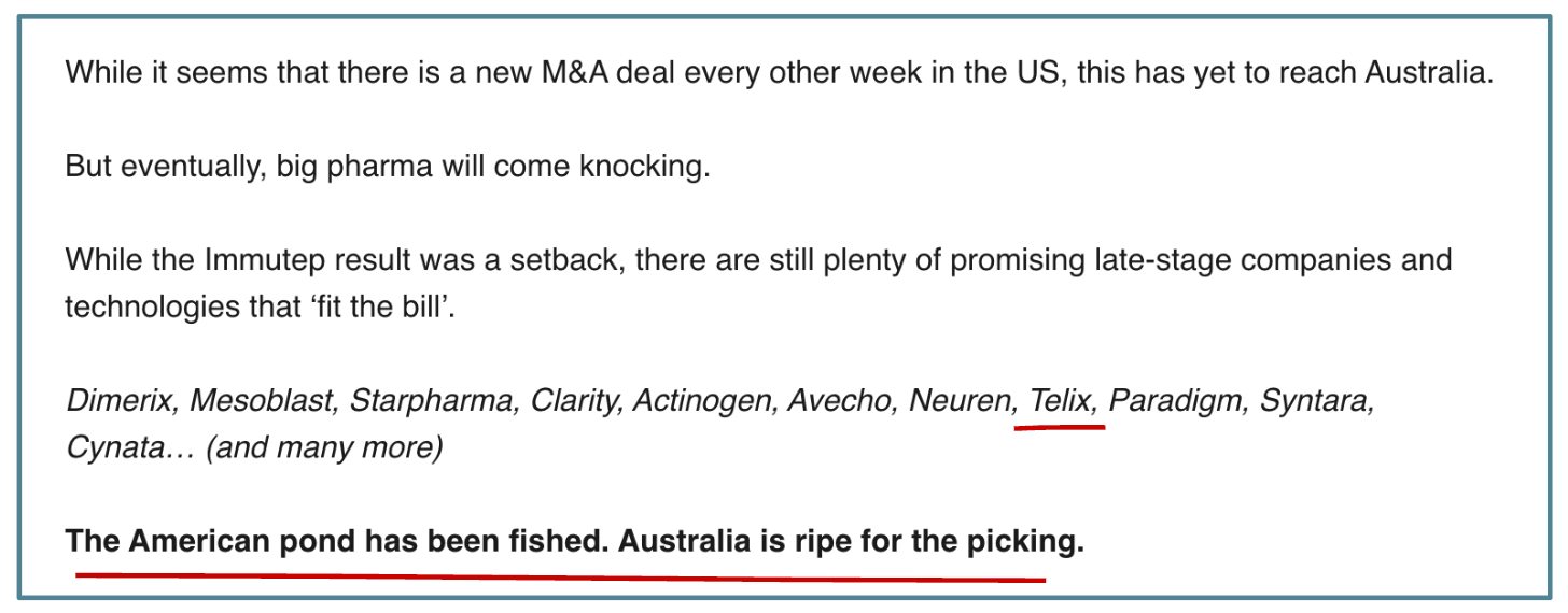 I also called out Telix by name as one of the companies that ‘fit the bill’ for an M&A or licencing transaction: