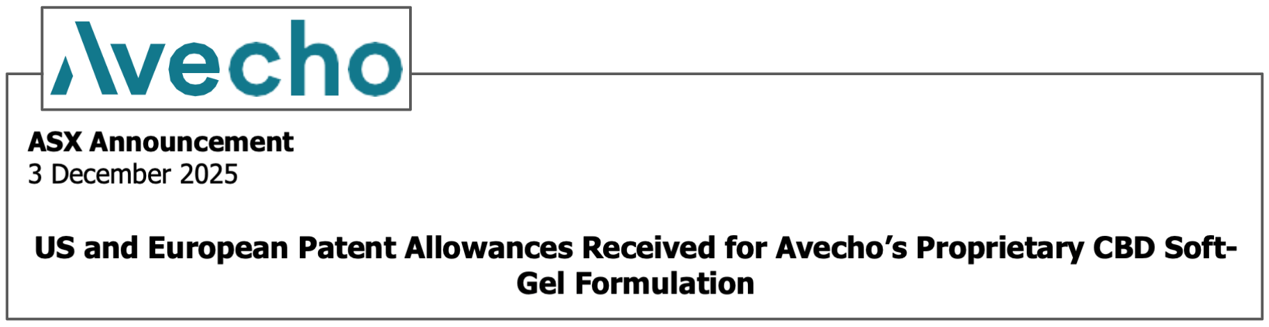 Interestingly, two weeks ago, Avecho applied for patents for its CBD soft-gel cap in the US and Europe.