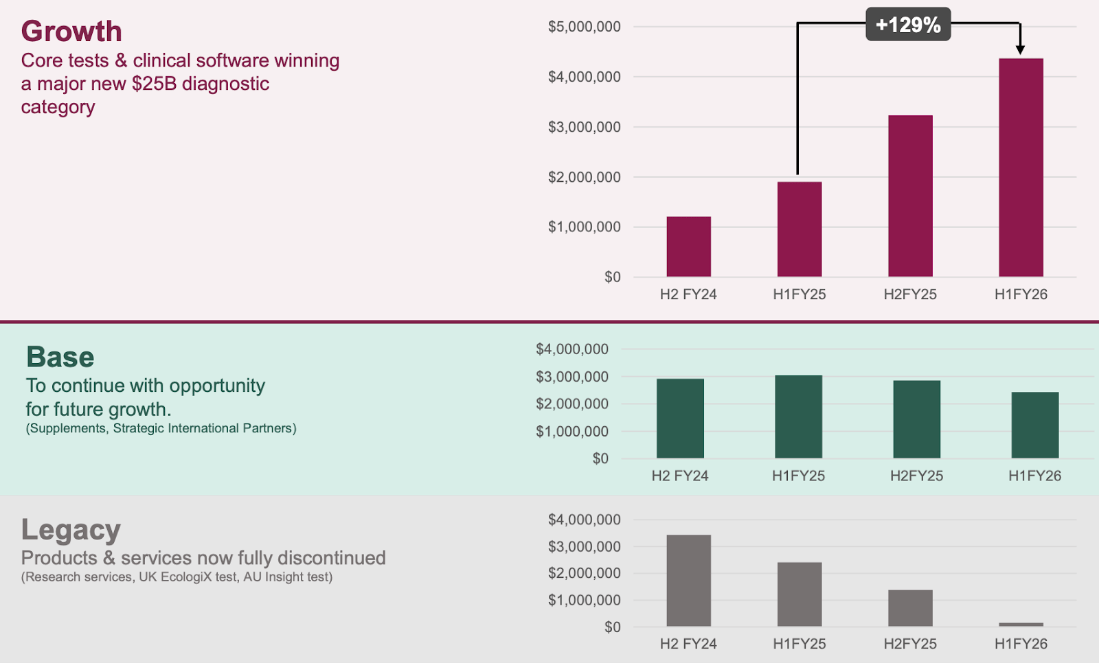 The next half will be the first time the legacy products no longer contribute to topline revenue. So all growth (and business attention) should be focused on the core testing platforms.