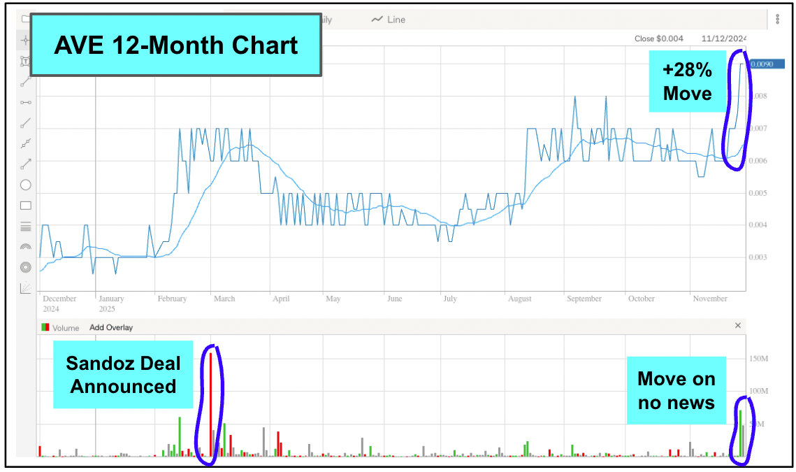 AVE recently raised $2.5M at $0.005, but this is the first meaningful volume going through the stock for months: